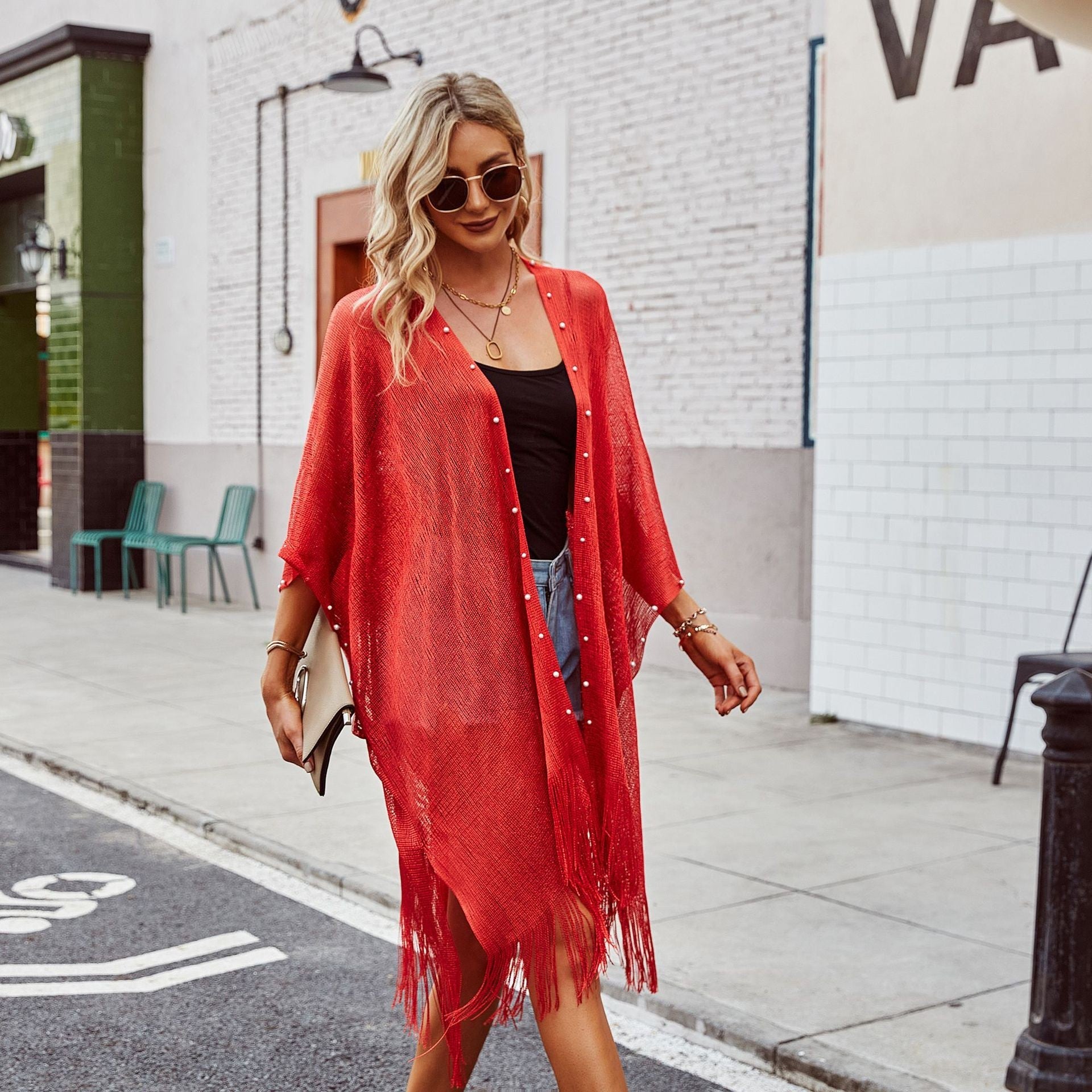The Selene Shawl is a lightweight, breathable wrap with shimmering pearl details. Perfect for beach days or evening cover-ups, it combines sun protection with a touch of glamour.